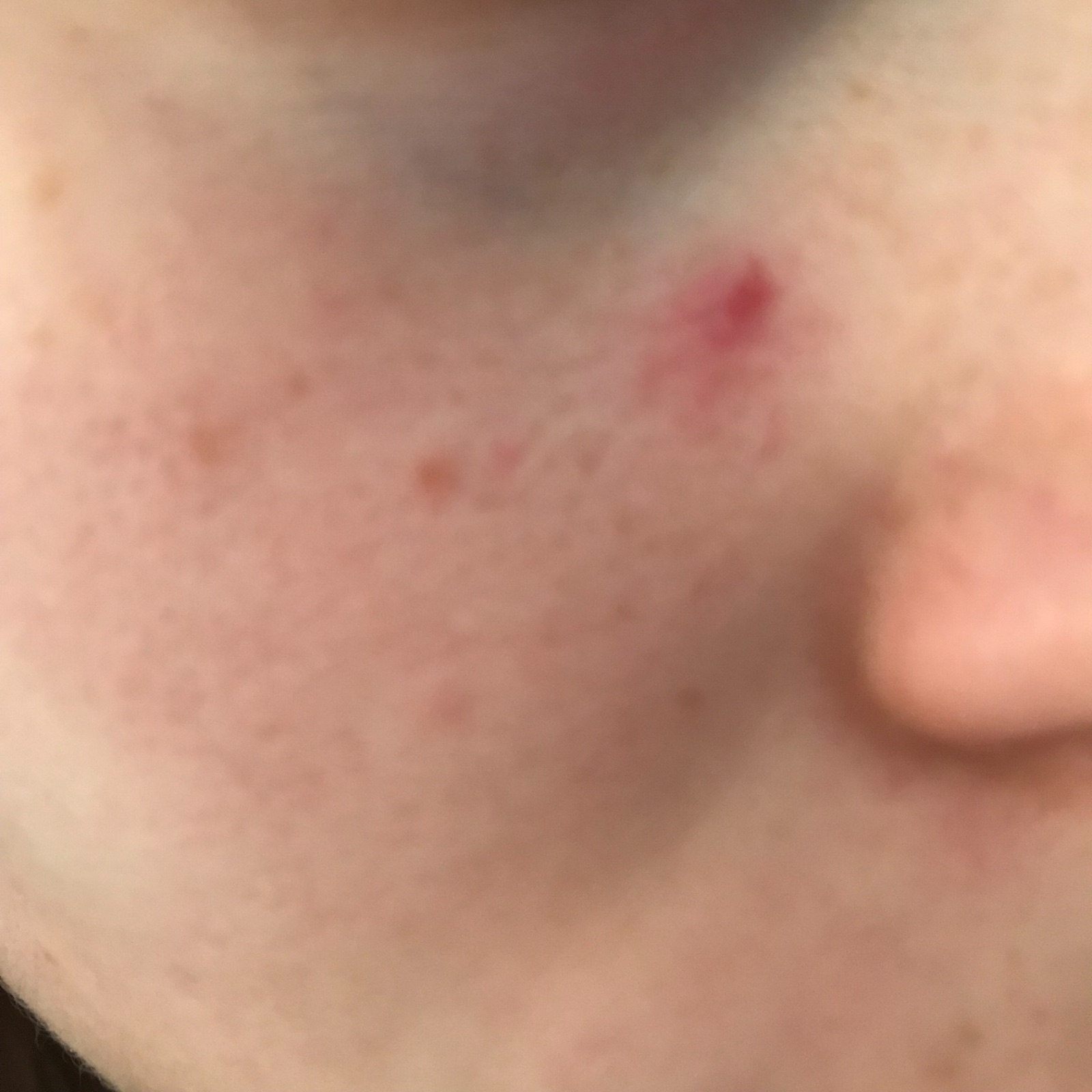 nález nie je veľmi dobre viditeľný. Môže ísť o drobný hemangióm, čo predstavuje útvar, ktorý vznikol spleťou tých najmenších cievok - kapilár. Ide o nezhubný útvar na koži, ktorý ak sa nezväčšuje nespôsobuje žiadne ťažkosti, ide skôr o kozmetický problém. Problémové sú vtedy, ak vyrastú do väčších rozmerov, alebo sa nachádzajú na citlivých miestach, ako sú napr. oči.