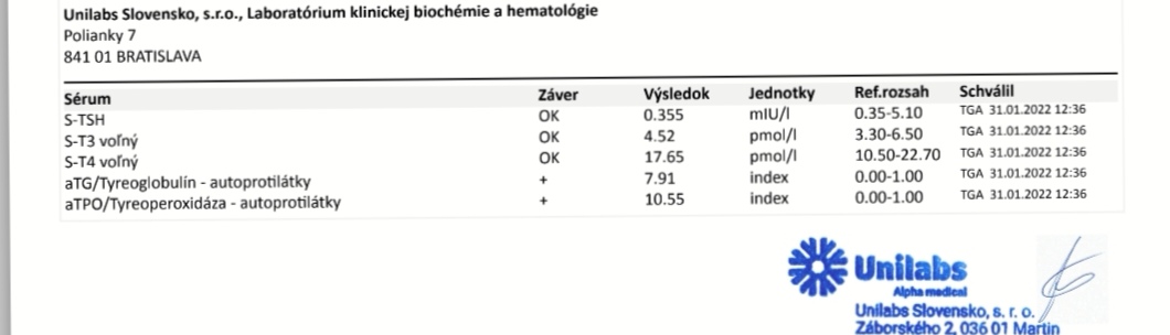 Behom jedného roka striedam na základe receptu od lekárky Thyrozol aj Euthyrox. Sledovať ma musia každé 4 mesiace. Robia mi krvné testy, lebo hodnoty mi zvykli kolísať. Teraz to skúšam bez liekov, pretože ma hnevá, že mi lekárka nevie nijako pomôcť.