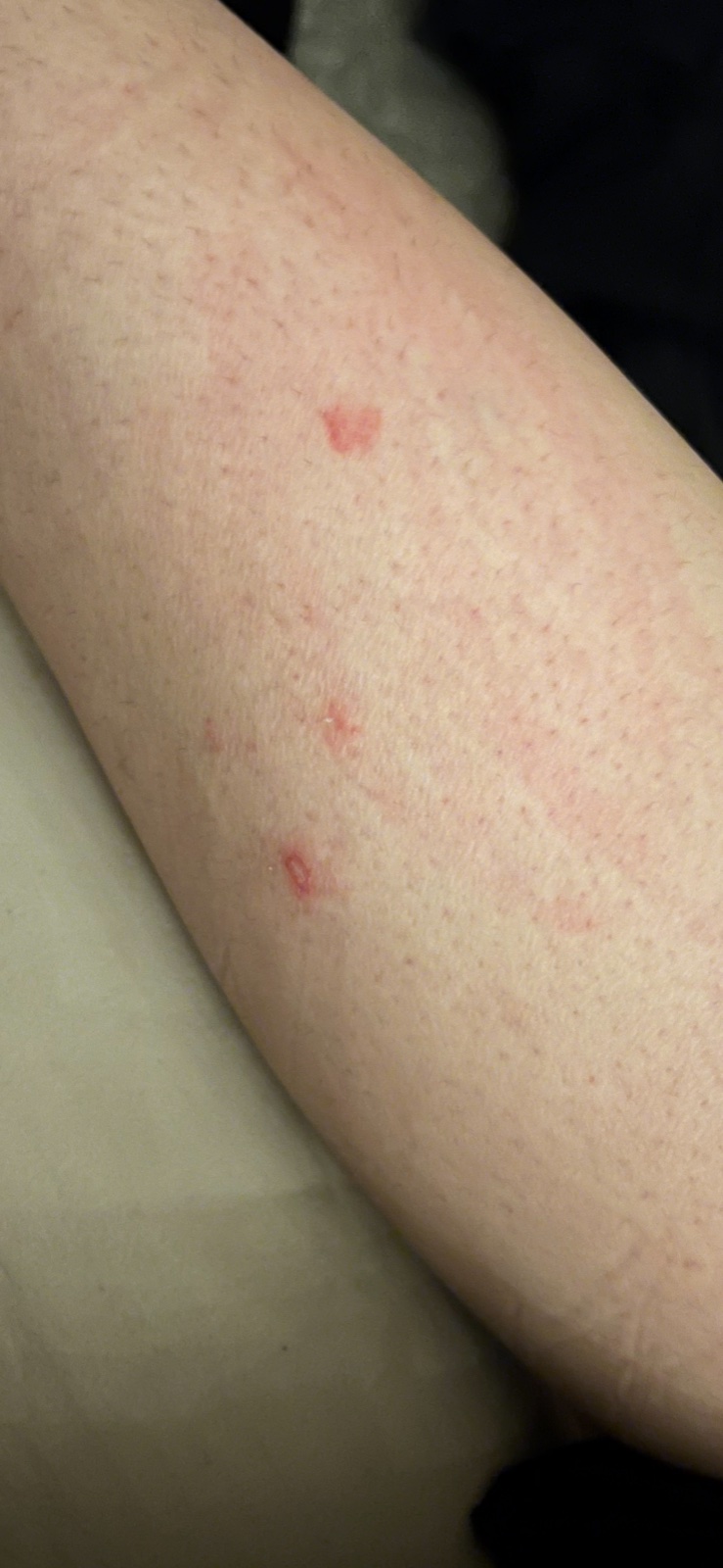 už 4 dni pozorujem na nohe tieto 3 začervenania. Nezväčšuje sa to, len občas to veľmi svrbí. Je to len na jedinom mieste, nikde inde po tele.