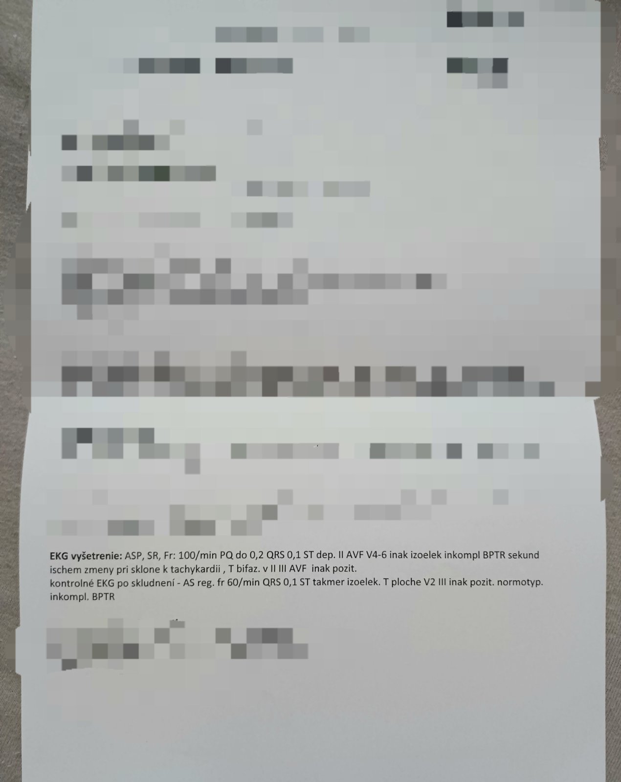 z práce ma poslali na preventívnu prehliadku, ktorej súčasťou bolo aj EKG vyšetrenie. Celkovo mám vždy pri vyšetreniach veľký strach. Lekárke sa EKG nepozdávalo a bolo potrebné ho o pol hodinu zopakovať. Pýtala sa ma, či sme mali v rodine infarkt. To ma dosť vystrašilo. Výsledok preventívky mi prišiel poštou. Objednala som sa zatiaľ s týmto výsledkom k obvodnej lekárke.