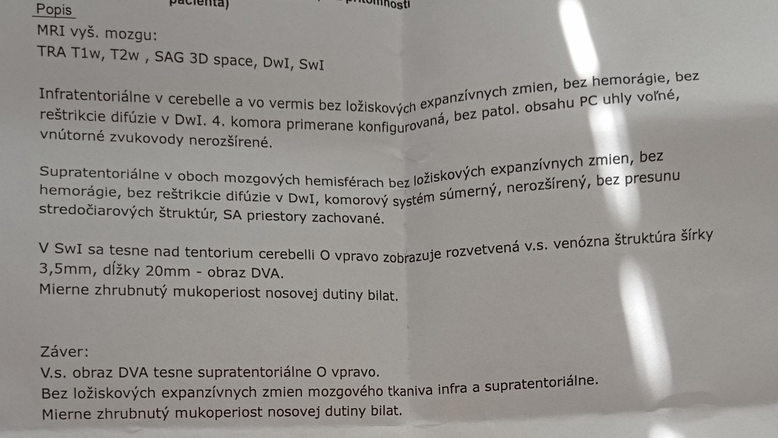 DVA je žilová anomália, ktorú máte nad mozočkom. Takúto anomáliu tak môžete mať dlhodobo. Ostatný nález na mozgu je v norme.