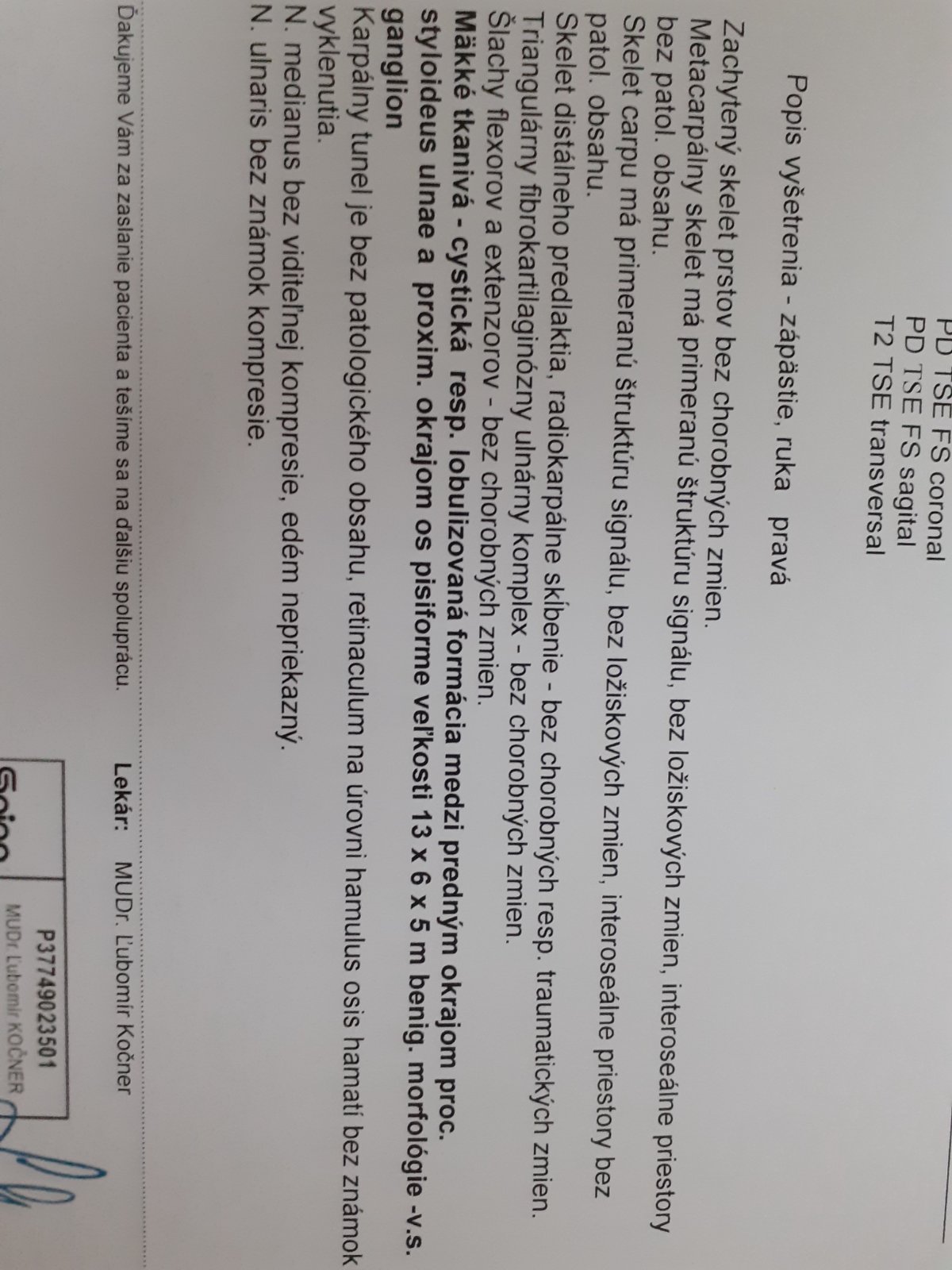nazáklade MR vyšetrenia máte prítomnú cystu - ganglióm v oblasti zápästia. Nejde o závažný nález. Najčastejšie na gangliómy objavujú pri preťažení.