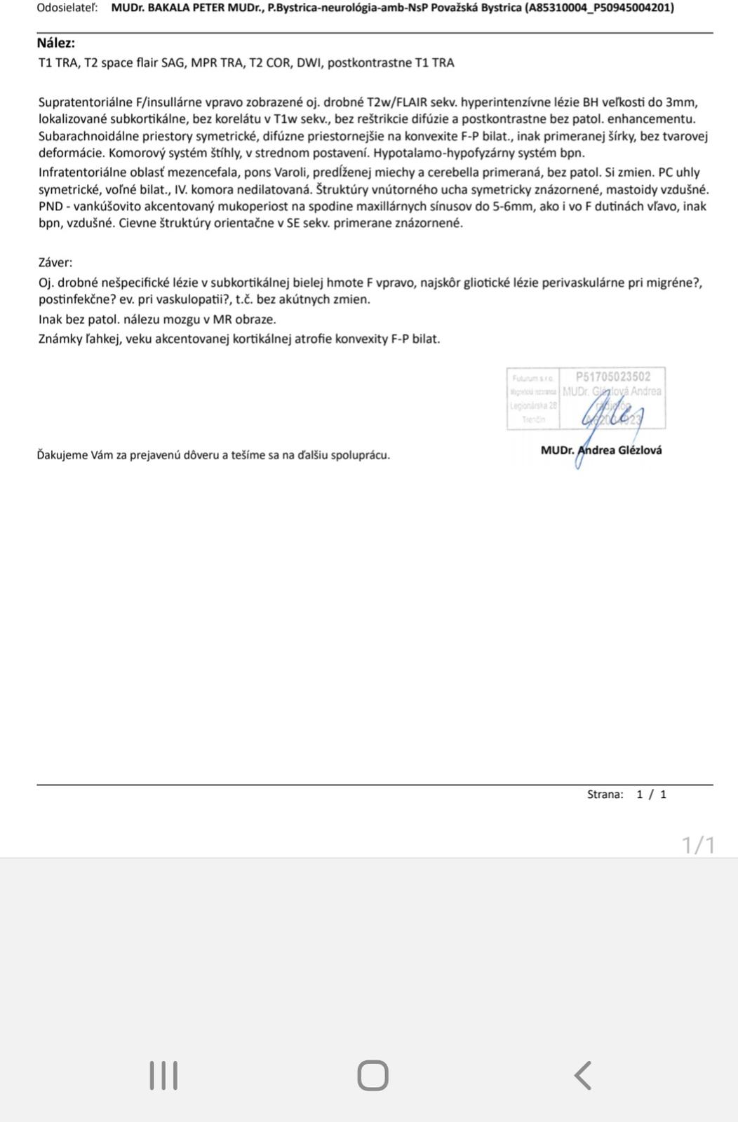 nález na mozgu je v poriadku, sú tam popísané iba drobné lézie na pravej strane v čelovom laloku, ktoré sú nešpecifické a nie sú prejavom žiadneho neurologického ochorenia.