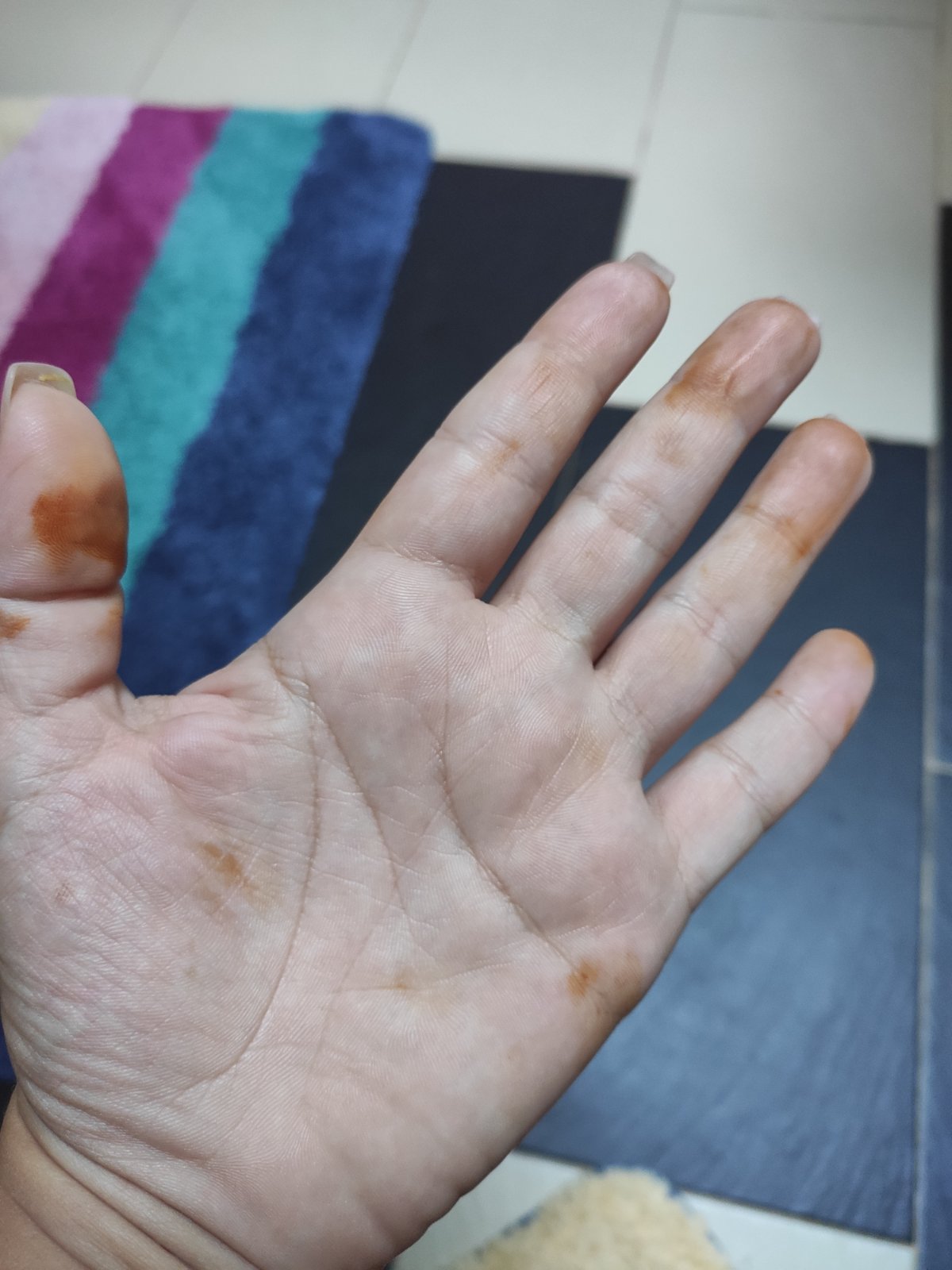 chcela by som sa poradiť ohľadom môjho problému. Od včera sa mi na jednej dlani objavili oranžovohnedé fľaky. Cez deň zmizli, ale dnes ráno ich mám znova. Je ich troška viac.