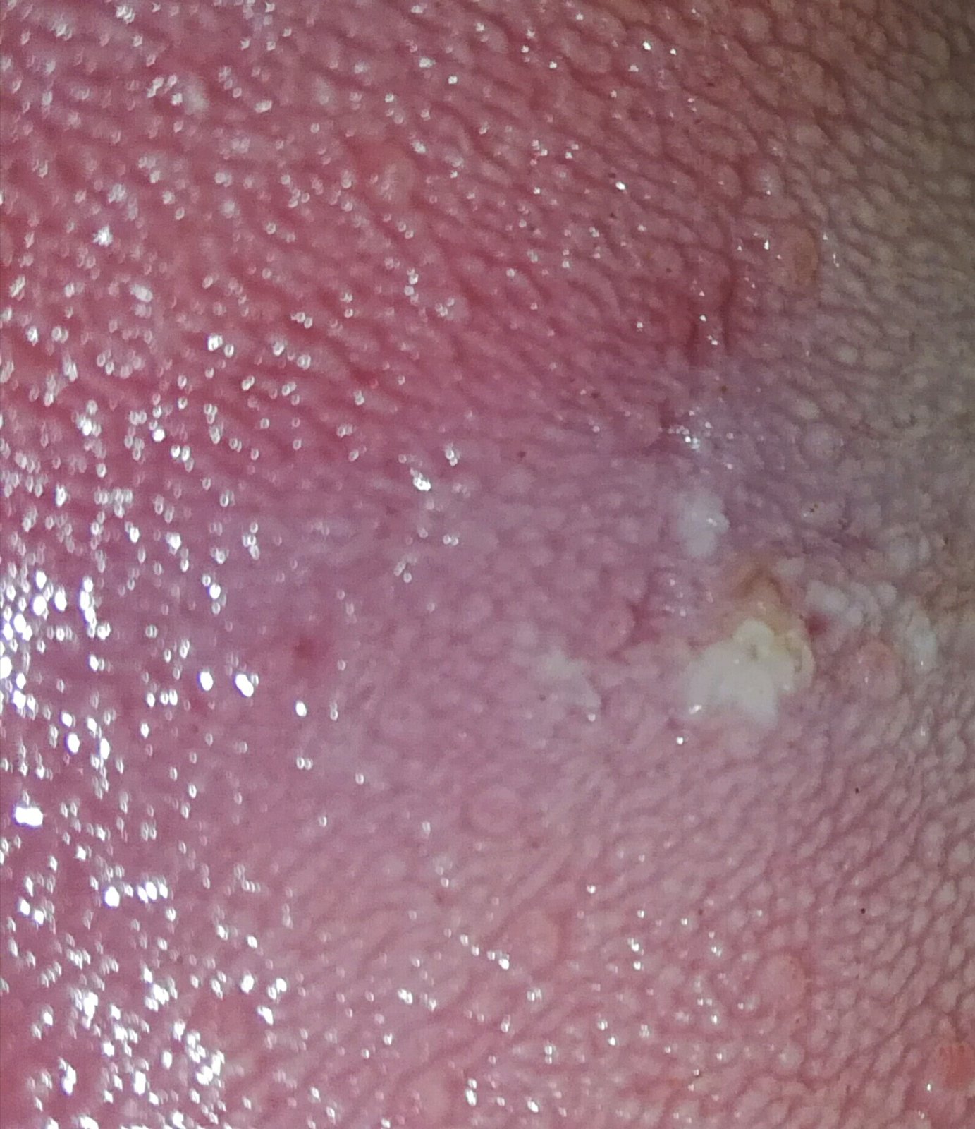 môže ísť o poranenie niektorej z väčších papíl jazyka (fungiformná papila), belavý povlak môže byť znakom procesu hojenia. Nateraz by som to len pozorovala a žiadnym spôsobom ďalej nedráždila, teda nestláčala ani zubami neprihrýzala.