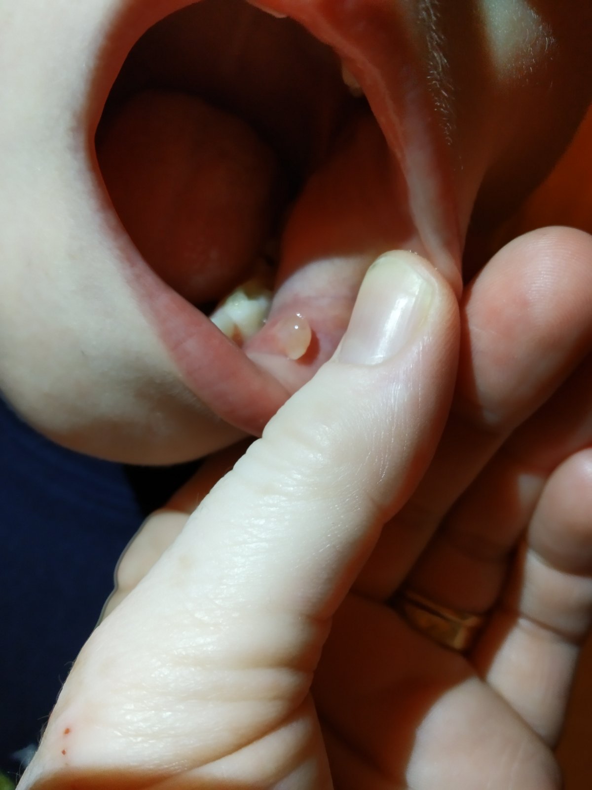 pravdepodobne ide o mukokélu - cystu, ktorá vzniká následkom uzavretia vývodu malej slinnej žliazky pri zahrýzaní do sliznice.