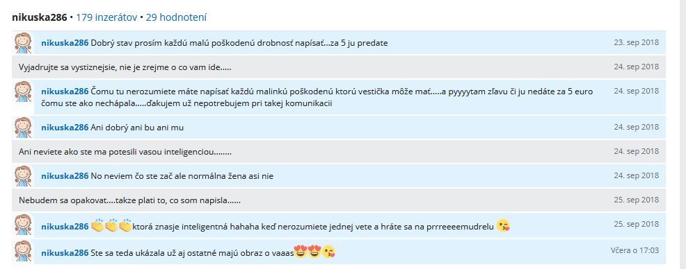 Ahojte, dávajte si pozor na nikuska286......v mojom bazáriku mala záujem o kúpu....na komunikáciu používa nevhodné až arogantné správanie. U mňa mala smolu, keďže sa prejavila hneď v prvej vete. Samozrejme obchod z mojej strany v tú sekundu bol hneď nereálny. Táto nevyzretá osobnosť ale nepozná hranice, tak vypisuje ďalej. Vidno, že jej je cudzie niečo také ako: „Inteligencia je páka, s ktorou môžeš pohnúť svetom.“