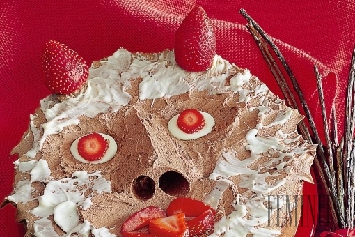 4. Tretinu krému natrieme na spodnú časť korpusu, priložíme vrchnú časť a mierne pritlačíme. Zvyškom krému potrieme povrch a okraje torty. Nožom urobíme na povrchu torty vlnky – chlpy čerta. Vytvarujeme nos, vytlačíme dve nosné dierky a tiež priehlbiny pre oči a ústa. Tortu vložíme do chladničky na dve hodiny stuhnúť.