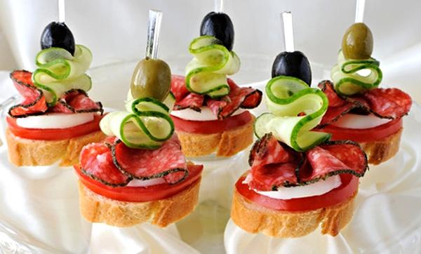 5. Nakonec doplníme o olivy a dáme do lednice zakryté potravinářskou fólií, nebo takto připravené jednohubky můžeme ihned podávat.