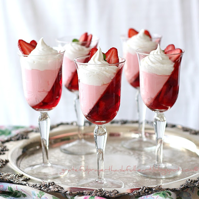 Želatínu si pripravíme podľa návodu na obale. Jahody si umyjeme, očistíme a nakrájame na menšie kúsky. Pripravenú želatínu si rozdelíme na polovicu. Do jednej polovice si pridáme na kúsky nakrájané jahody. Poháre si nakloníme a navrstvíme jahodovú želatínovú hmotu. Necháme stuhnúť. Do druhej polovice pripravenej želatíny si pridáme polovicu vyšľahanej smotany a spolu zmiešame. Keď máme želatínu v pohári stuhnutú, môžeme vrstviť šľahačkovú želatínu. Znova necháme stuhnúť a na vrch navrstvíme vyšľahanú šľahačku. Ozdobíme čerstvými jahodami a podávame.