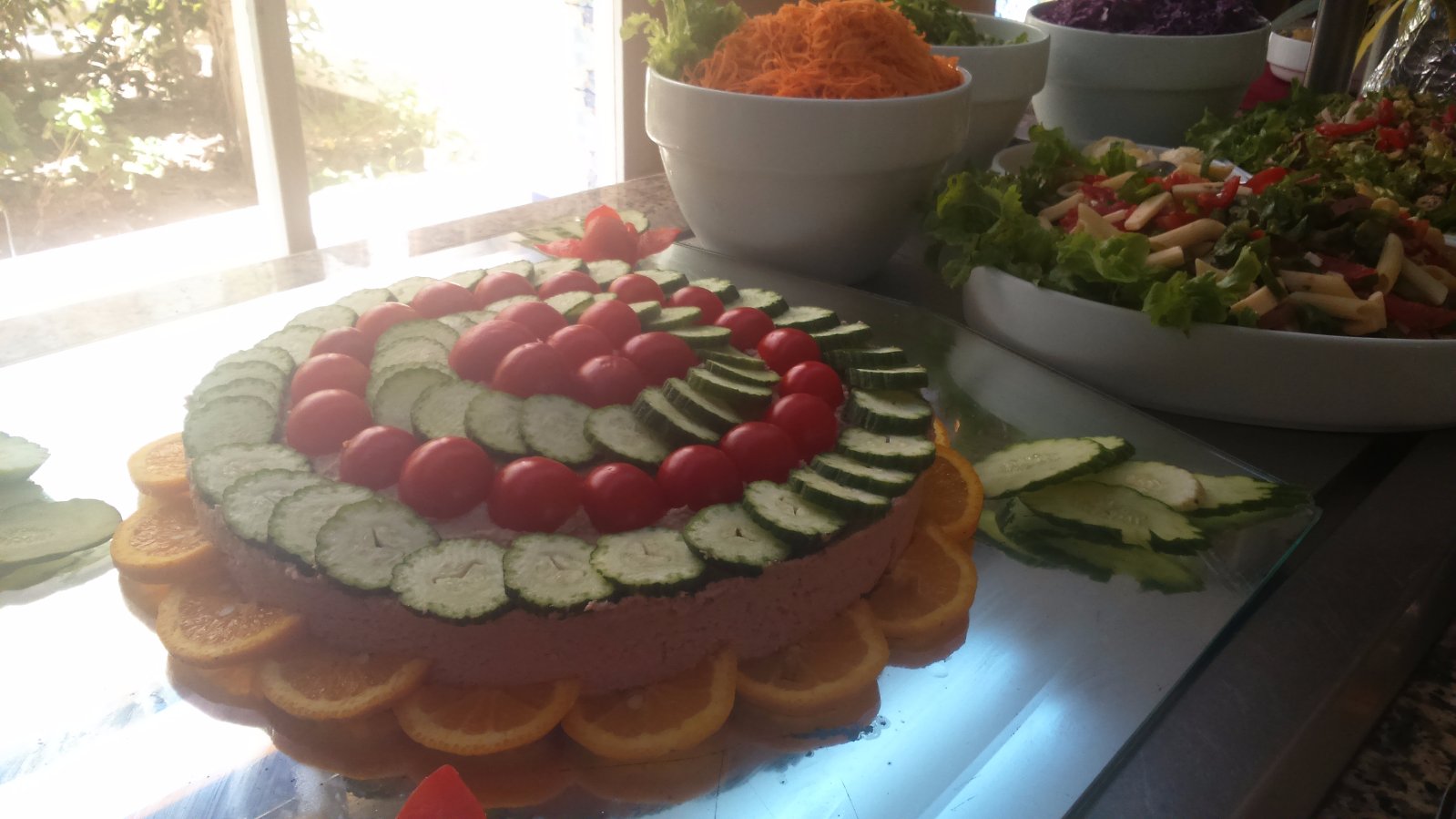 na oslavu ,vela pomazanky,natierky v tvare torty a ozdobene uhorkami ,paradajkami a pomarancom okolo