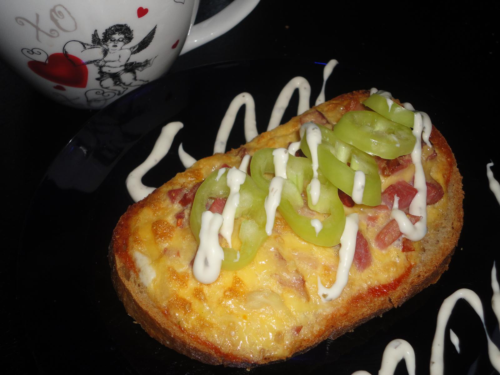 Chlieb rozlozime na papier na pecenie ,potrieme kecupom ,rozslahame si 3vajicka ,nakrajame sunku ,pridame syr ,akykolvek chcete ,mozete dat ja zeleninu ,podla svojich predstav ,muzovi to robim aj s niva syrom ,vsetko zamiesame ,naporcujeme na chleby a dame zapiect🙂dobre aj teple aj studene🙂dobru chut my ho mame velmi radi