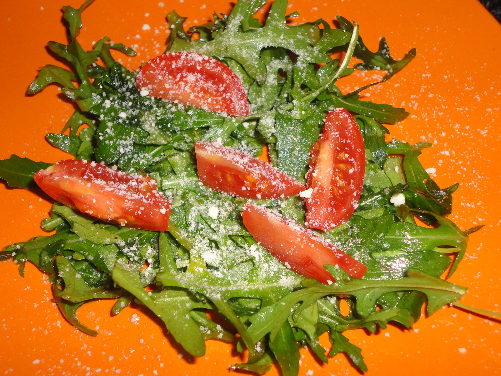 Rukola ,paradajky ,parmezan ochutene oliv. olejom balzamiko :-)