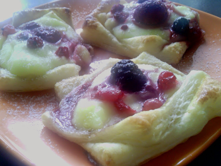 Uvaríme si puding .zapracujeme do neho maslo .Cesto si rozlozime alebo rozvalkame ,povykrajujeme stvorce asi 5cm .Na plech vystlanym papierom na pecenie prelozime polovicu stvorcov a na kazdy este pridame jeden tak aby tvorili hviezdicku .Pri skladani kazdy kus potrieme vajickom ..Do stredu kazdej hviezdicky dame puding,pridame trochu ovocia ,ja som davala zamrazene a posypeme kryst,cukrom,kraje potrieme vajcom .Pecieme 200st . 10min a potom znizime teplotu na 180 st a dopecieme kolaciky..Dobru chut su vyborne ,robila som dvojit davku a aj tak bolo malo