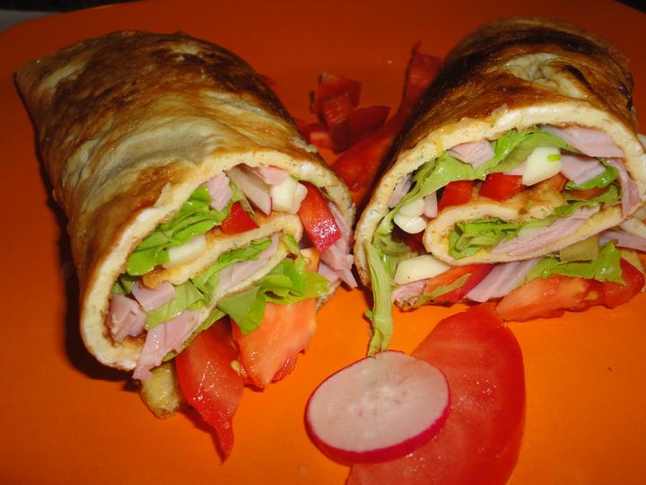 Vo svojej najväčšej panvici na miernom ohni urobíme placku z vajec .Vajcia posypeme pažítkou a necháme na panvici 30 sekúnd – 1 minútu. Omeletovú placku dáme dole z panvice . Potriemeju pestom,akekoľvek doma máte ,podľa chuti ,ale nemusí byť a potom posypeme syrom a šalátom,ja som robila sunka ,paradajka ,kapia zelena paprika redkovka ,pokrajane na tenke pasiky aby sa mi to dobre rolovalo . Omeletu zrolujeme do placky. Placku prerežeme diagonálne na polovicu.Dobru chuť želám ,zmena je život a mojim chlapom chutila🙂