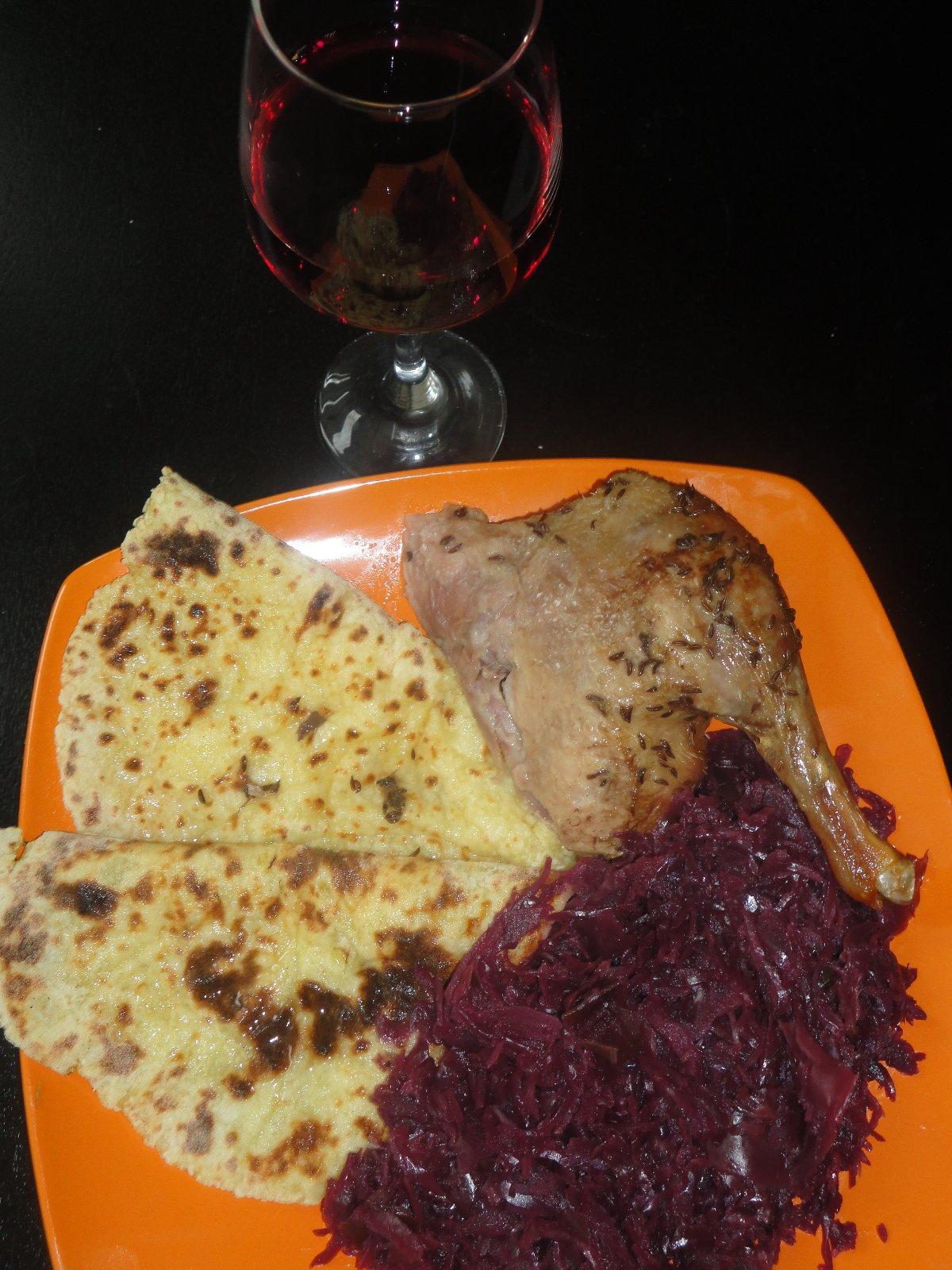 Pečená kačka ,domáce lokše červena kapusta s karamelizovaným cukrom a jablkom ,červené suché vínko