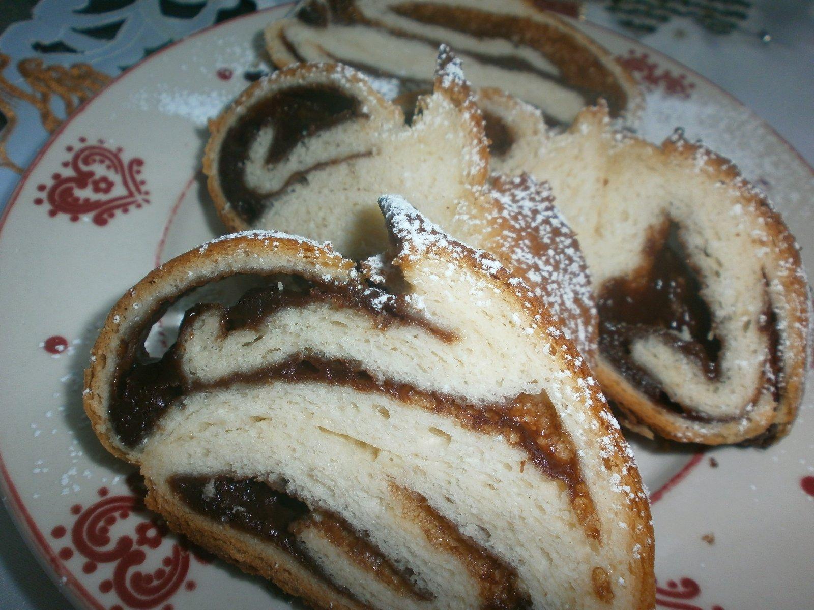 Pudingos Plnka 300 ml studeného mlieka 4 lyžice holandského kakaa 1 čokoládový puding v prášku 150 g krupicového cukru 150 g zmäknutého masla Cesto 450 g hladkej múky 80 g práškového cukru 3 lyžice zmäknutého masla 200 ml vlažného mlieka 1 kocka droždia 2 bielky štipka soli Na potretie 50 g roztopeného masla Postup Plnka V menšom hrnci si v studenom mlieku rozmiešame preosiate kakao, pudingový prášok a krupicový cukor. Za stáleho miešania privedieme k varu a uvaríme hustý puding. Necháme ho trochu vychladnúť a do vlažného postupne pridáme zmäknuté maslo, ktoré sa v pudingu rozpustí. Dôkladne premiešame. Puding prelejeme do sklenenej misky, prikryjeme potravinovou fóliou (to nám zabezpečí, že sa na ňom nevytvorí kožka) a necháme vychladiť v chladničke. Cesto Kým plnka chladne, pripravíme si cesto. V miske si zmiešame múku, práškový cukor, zmäknuté maslo, vlažné mlieko a rozdrobené droždie (kvások netreba pripravovať samostatne). Pridáme sneh z 2 bielkov, ktorý sme si vyšľahali spolu so štipkou soli. Cesto miesime, až kým sa nezačne oddeľovať od stien misky. Ak je príliš tuhé, môžeme ho zriediť trochou vlažného mlieka, ktoré pridávame po lyžiciach. Cesto netreba nechať kysnúť, ale hneď ho naplníme čokoládovou plnkou. Záviny Cesto si preložíme na pomúčenú drevenú dosku a ešte trochu rukami premiesime. Bochník cesta rozdelíme na 4 rovnaké časti, ktoré rozvaľkáme na asi 0,5 cm hrubé obdĺžniky. Každú časť cesta potrieme 3-4 lyžicami čokoládového pudingu (nie úplne po okraj) a cesto zrolujeme. Dve zrolované cestá na jednom konci spojíme a prepletieme jedno cez druhé. Vzniknú nám tak 2 záviny, ktoré opatrne preložíme na plech vystlaný papierom na pečenie a potrieme roztopeným maslom. Pečieme vo vyhriatej rúre pri 180 °C asi 40 minút do zlatohneda. Ihneď po upečení potrieme zvyšným roztopeným maslom. Servírovanie Pred podávaním posypeme práškovým cukrom.