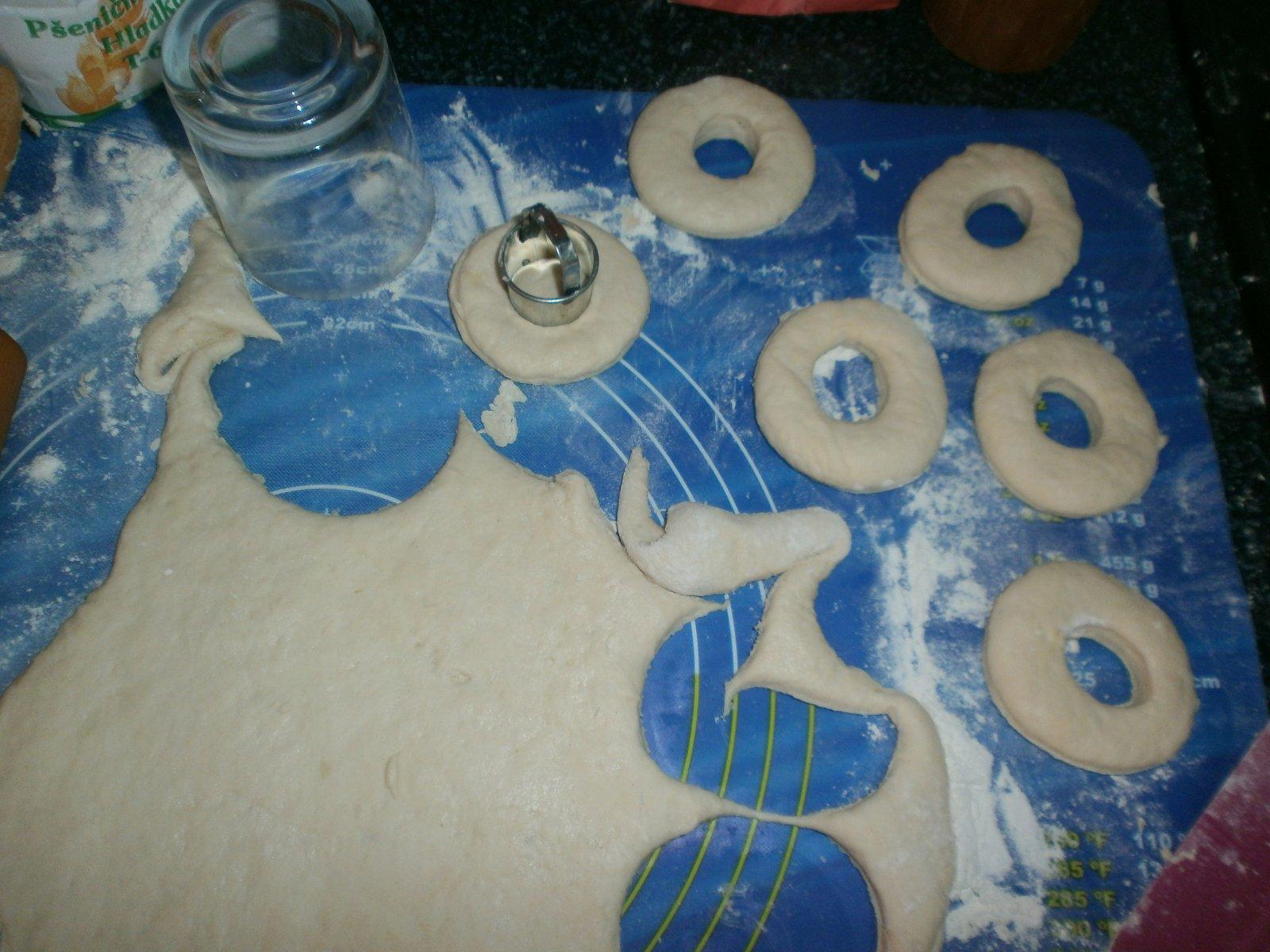 2. Potom cesto prepracujeme a rozvaľkáme na plát hrubý asi 1 cm. Vykrajujeme z neho kolieska s priemerom 8 cm a v ich strede vykrojíme na pomúčenú dosku a prikryjeme utierkou. Necháme ďalších 30 minút kysnúť