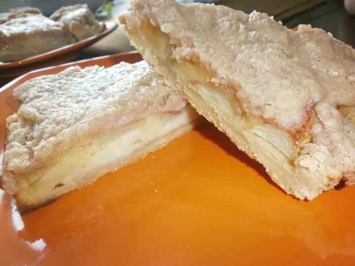 Hruškový koláč s krémom 5 hrušiek 200g hladkej múky 120g masla Soľ Bielok Krém : 120ml kyslej smotany 3žĺtka 100g kryštálového cukru 30g hladkej múky Mrvenička : 60g masla 75g hladkej múky 60g kryštálového cukru ½ lyžičky mletej škoricie K múke na cesto pridáme troška soli ,mäkké maslo a zmes rozmixujeme ,kým nevzniknú jemné hrudky . K mase pridáme 2 lyžice vody a do hladka vymixujeme .Potom cesto vyvaľkáme a preložíme do tortovej formy priemer 24- 26cm vyloženej papierom na pečenie. Dáme piecť asi na 20min do vyhriatej rúry 180st . Predpečený plat potrieme bielkom a ešte zapečieme na 1minútu . Hrušky očistíme ,pokrájame na tenké plátky. Potom vymiešame z kyslej smotany , zo žĺtkov, z cukru a z muky vymiešame hladký krém bez hrudiek .Na upečený korpus rozložíme hrušky ,zalejeme ich krémom a pečieme ďalších 20minút. Z masla ,múky , cukru a zo škorice si pripravíme mrveničku .Upečený koláč ňou posypeme ,zakryjeme ho alobalom a ešte na 2- 3 min. vložíme do rúry .