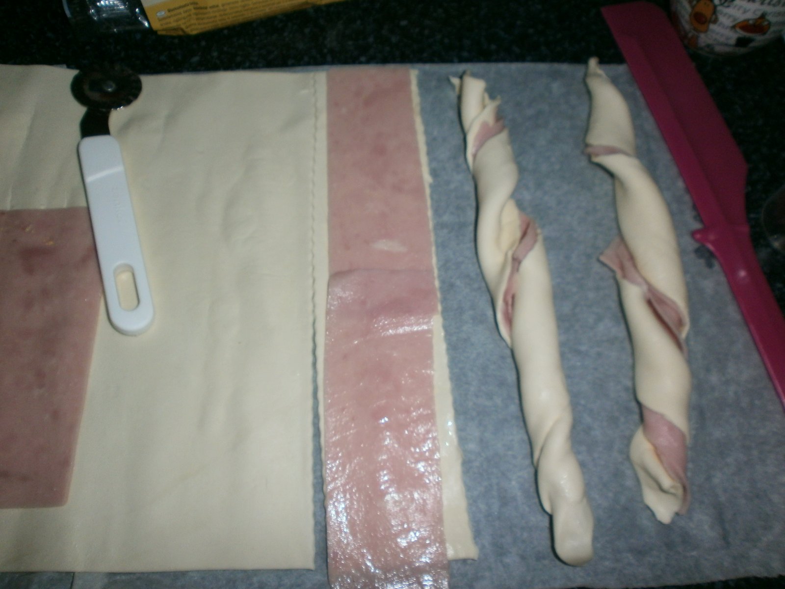 autor@fxcvikotova možností je veľa ,podľa chutí ,rozvaľkať lístkové cesto ,ja som mala to rozvaľkané ,je to ešte rýchlejšie 🙂 dala som len šunku ,zrolovala ,potrela vajičkom zmiešaným vegetou ,posypala rozmarínom aniektoré rascou ,pečieme pri vysokých teplotách ,každá si poznáme svoju rúru 🙂