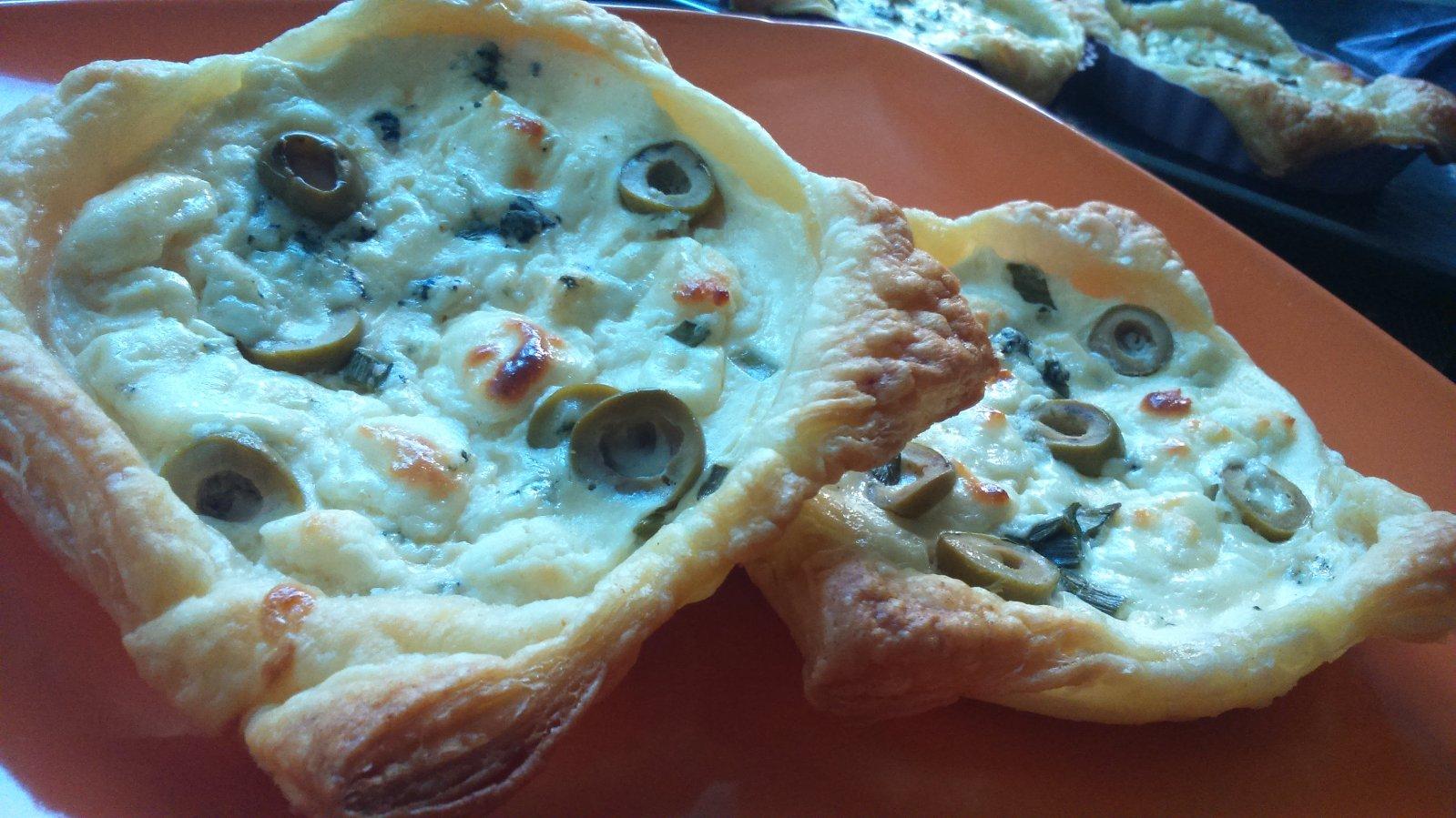 Bryndza 1 vyvaľkané lístkové cesto 250 ml kyslej smotany 1 vajíčko Soľ vegeta olivy syr niva . Habarkou zmiešajte vajíčko a smotanu, pridajte štipku soli. Lístkové cesto nakrájajte na 6 štvorcov. Cestom vyložte misky vo forme na mafinky alebo torticky tak, aby rohy cesta pretŕčali. Bryndzu rozdeľte do misiek z lístkového cesta. Každú tortičku zalejte smotanovou polevou. Pečte na začiatku pri vyššej teplote, aby sa lístkové cesto pieklo a nezačalo sa topiť – teda pri 220 stupňoch asi 10 minút, potom asi 10 minút pri teplote 170 stupňov dopekajte plnku.