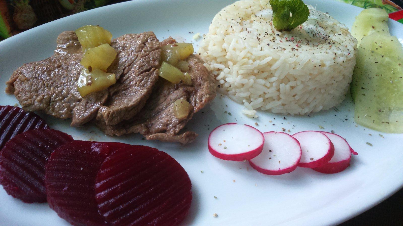 hovadzina na prirodno ,uhorkova omacka,ryza