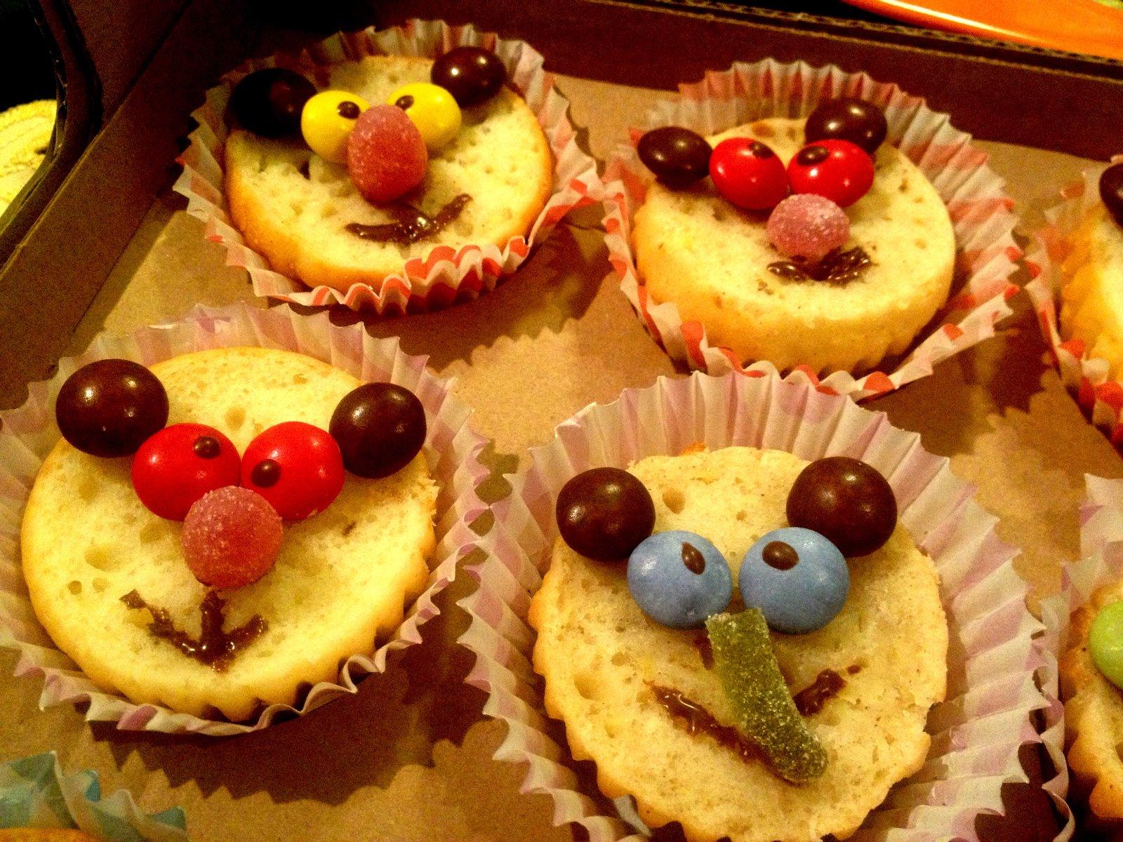 ozdobovanie ,Odkrojila som vrch a urobenou čokoládou som pripevňovala lentilky a noštek z želé cukríkov ,ústa nakreslené čokoládou,