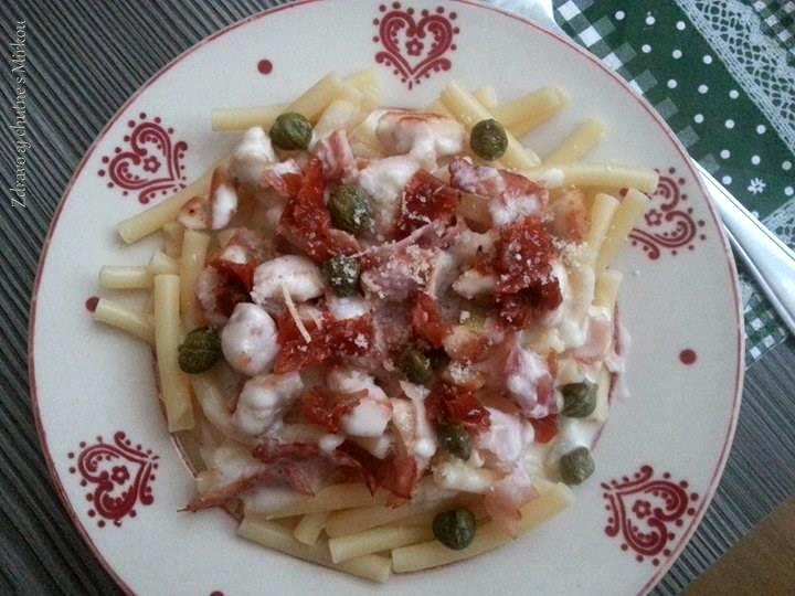 Jednoduché a rýchle, cestoviny v syrovej omáčke s kuracím mäsom opečenou šunkou, sušené paradajky a ako pre mňa kapary
