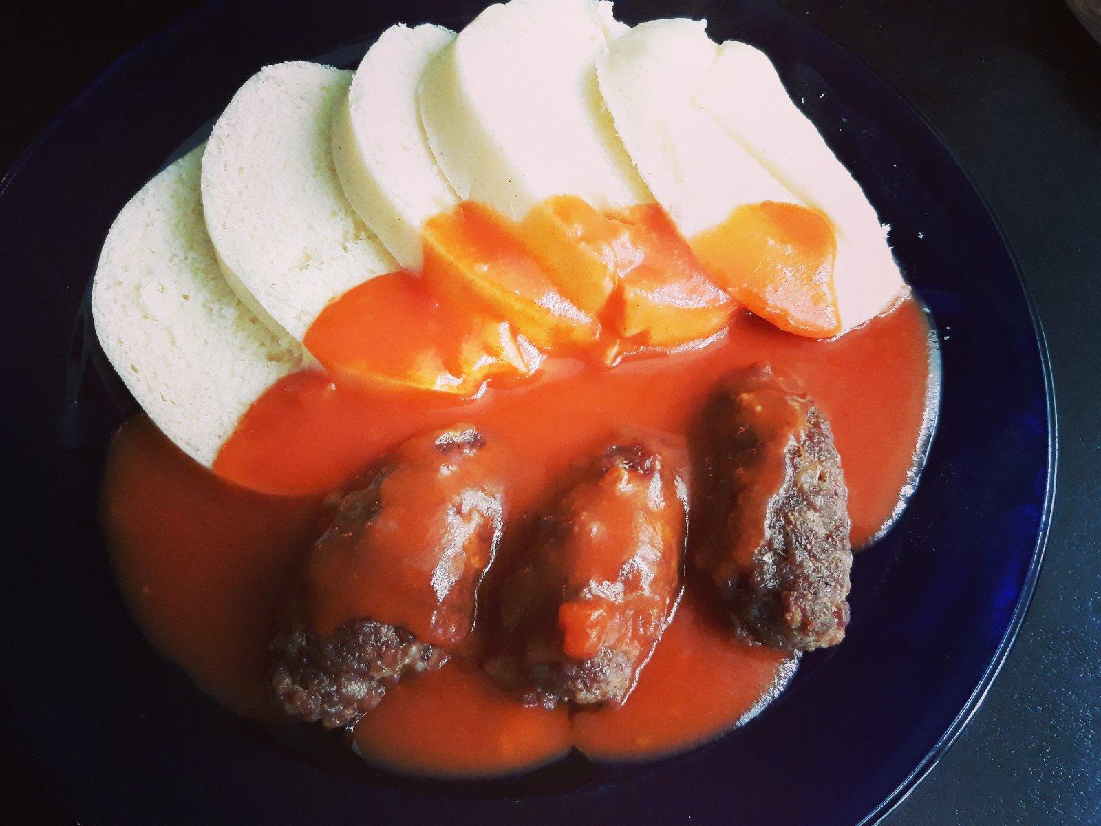 Pecene cevabcici , paradajkova omacka , knedla