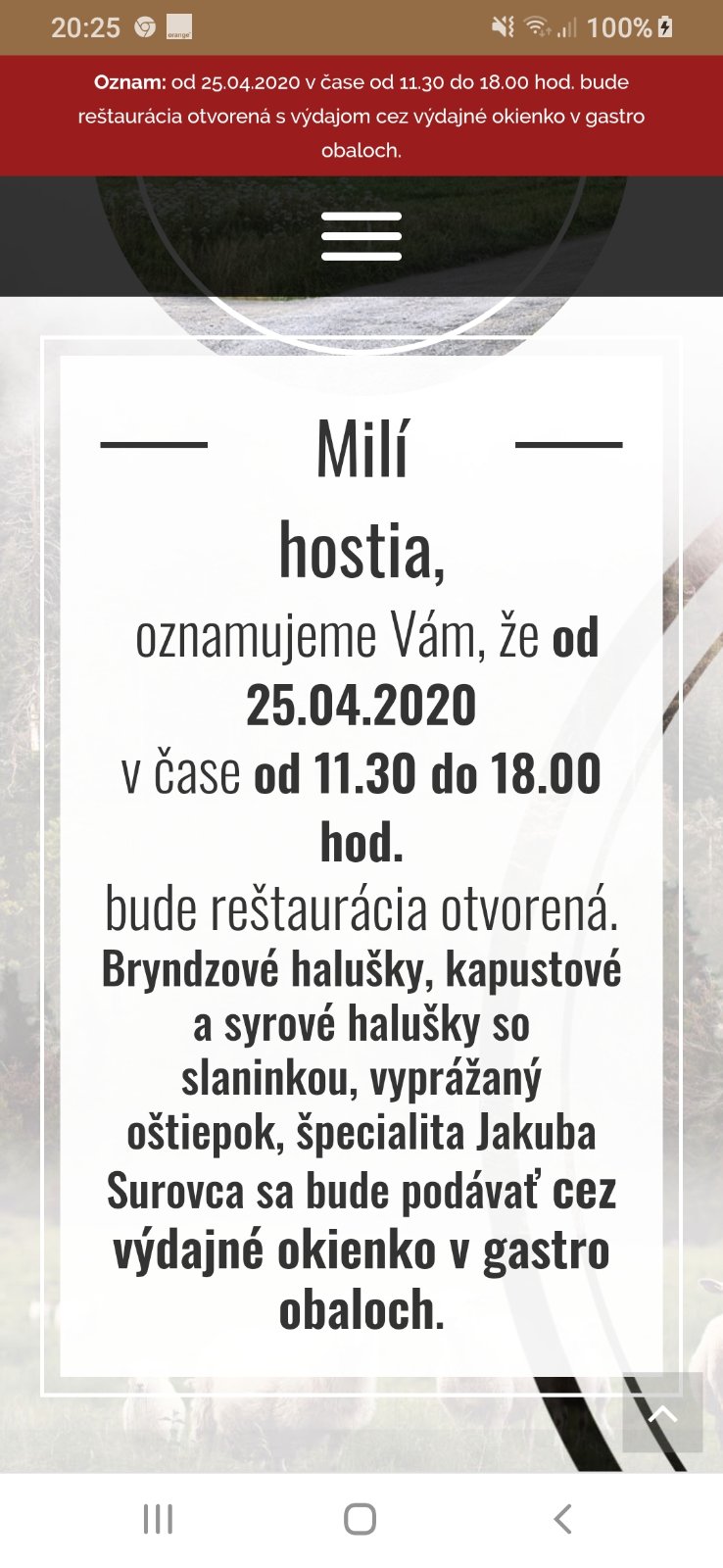 Otvorené. Salaš Zbojská aj keď jedlo len so sebou. Ale vychutnať si ho môžete aj na lúke v krásnom prostredí. #spolutozvladneme a držíme palce aj Vlčekovcom aby vydržali. ❤