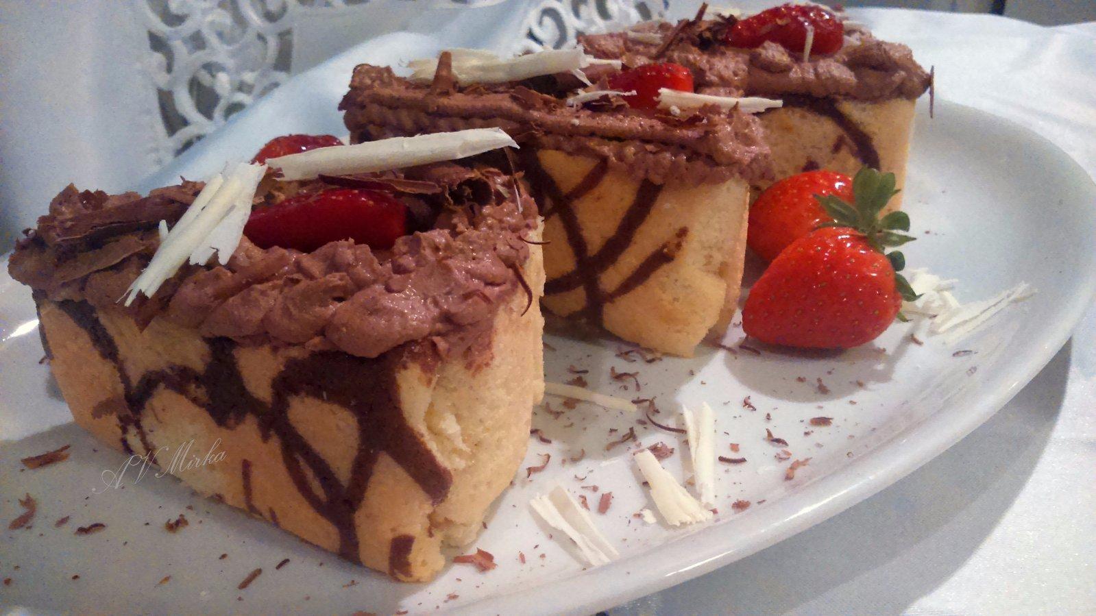 cesto ako na roládu ,podavat do formiciek ,naplnit kremom ,vlozit do vnutra este jahodu ,znova zaliat kremom , nechat stuhnut a ozdobit podla svojej fantazie🙂