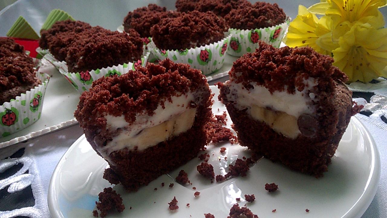 Do vydlabaného vnútra pridáme jedno koliesko banánu, zalejeme plnkou a posypeme cestom, ktorý nám ostal.