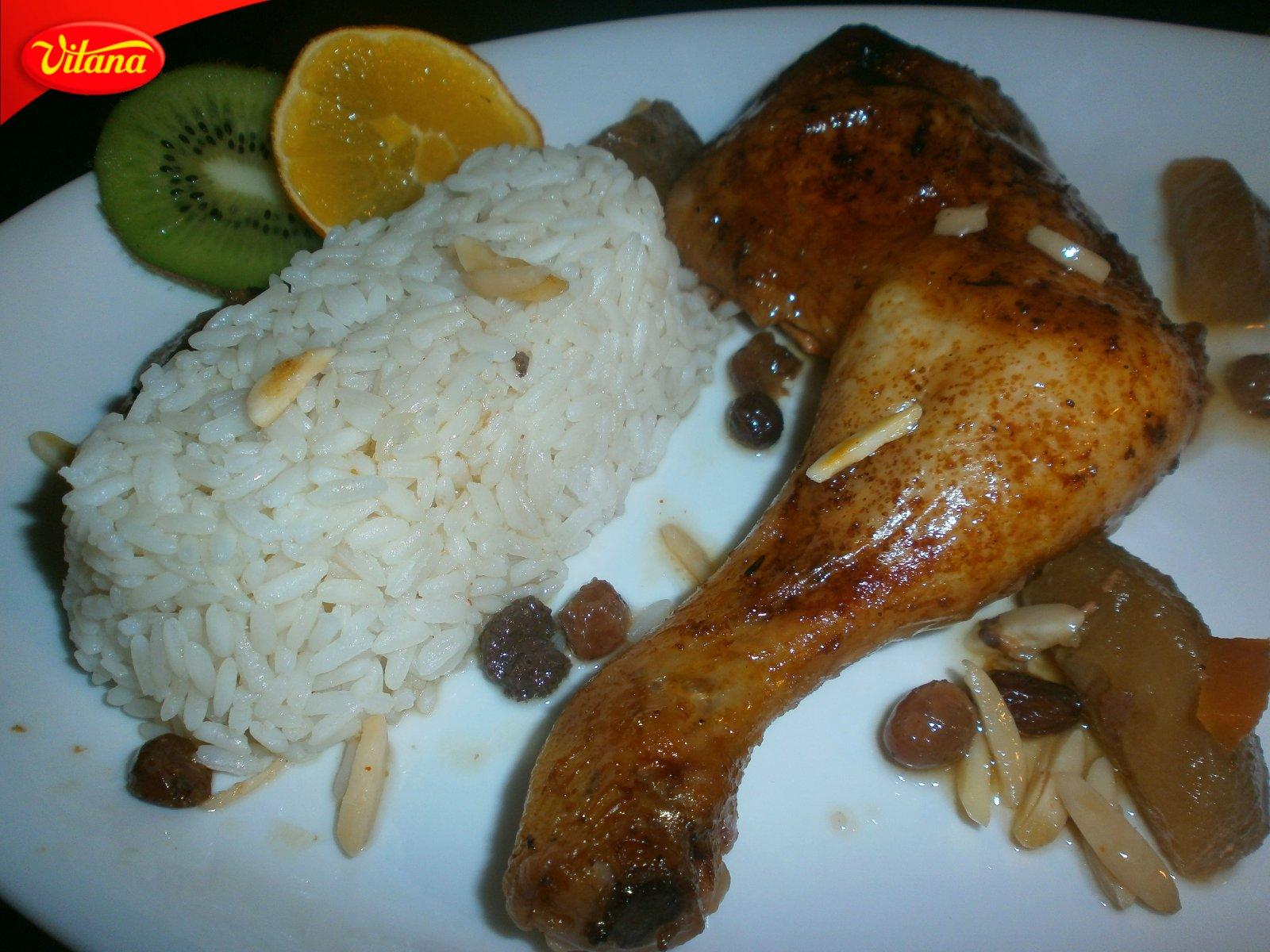 Kuracie stehná, soľ , korenie , vývar , med, jablka , hrozienka madľové lupienky ,alebo mandle ,príloha ryža recept nájdete zajtra v albume #vitana žite s chuťou hlavné jedlá