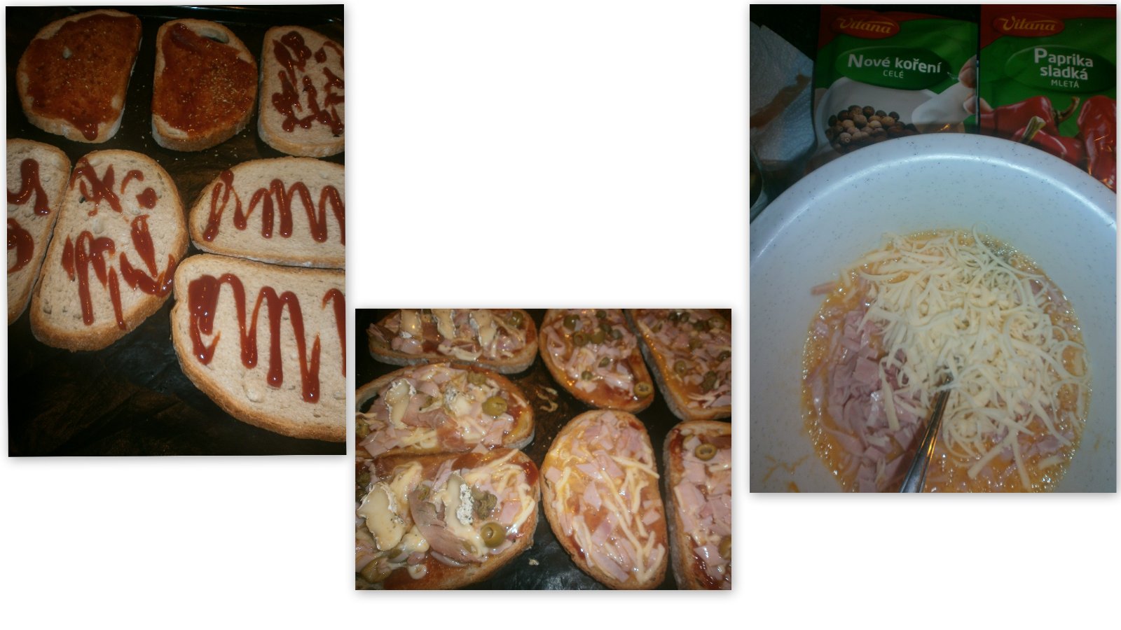 Chlieb natrieť kečupom ,pripraviť si vajíčka pokrájanú šunku ,postrúhaný syr a ostatné na vlastnej fantázii a hlavne kto čo môže 🙂 premiešame ,dáme na chleba a zapečieme .Dobrú chuť