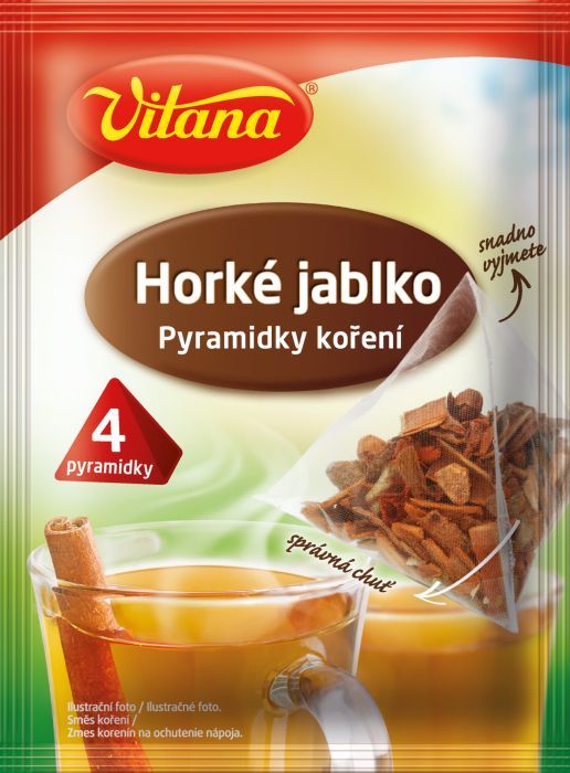 #vitana Vitana pyramídové vrecúško s korením obsahuje veľké kúsky kvalitného korenia na jednoduchšiu a rýchlejšiu prípravu nápoja Horúce jablko. Potrebné korenie máte vždy pohromade. Vrecúško korenia jednoducho vhodíte priamo do hrnca a po uvoľnení arómy a prevarení ho ľahko vyberiete. V balení je 7 pyramídových vrecúšok, s jedným vrecúškom pripravíte 1 liter džúsu.