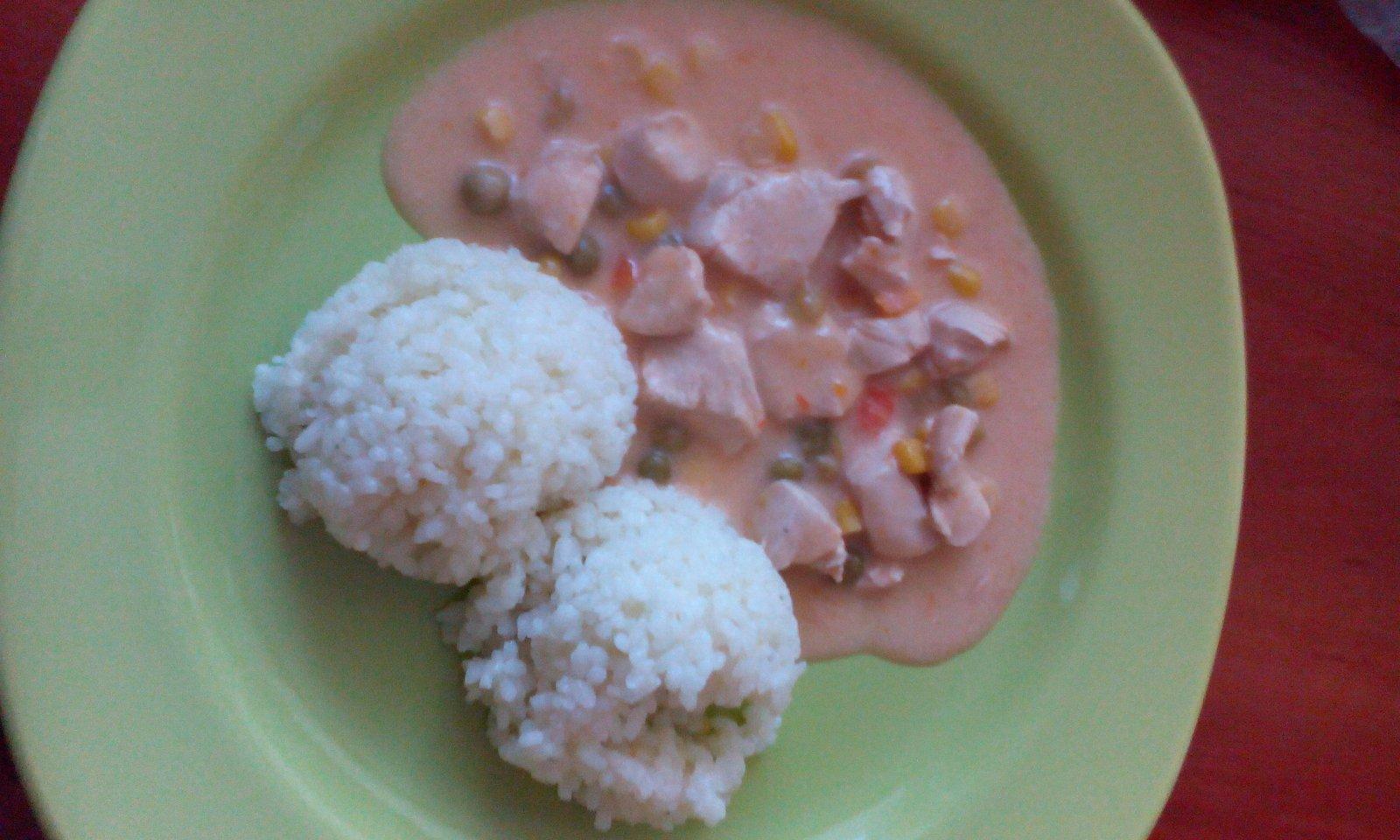 Postup : Mäso si umyjeme , nakrájame na sote . Na panvici si rozpalime troška oleja pridáme mäso , osolime. Pridáme mrazenu zeleninu ( alebo z konzervy ) , kečup 5 polievkovych lyžic , 2 polievkove lyžice horčica ...podusime a na konci pridame šľahačkovu smotanu a dobre premiešame. Podávame s ryžou alebo aj cestovinou.