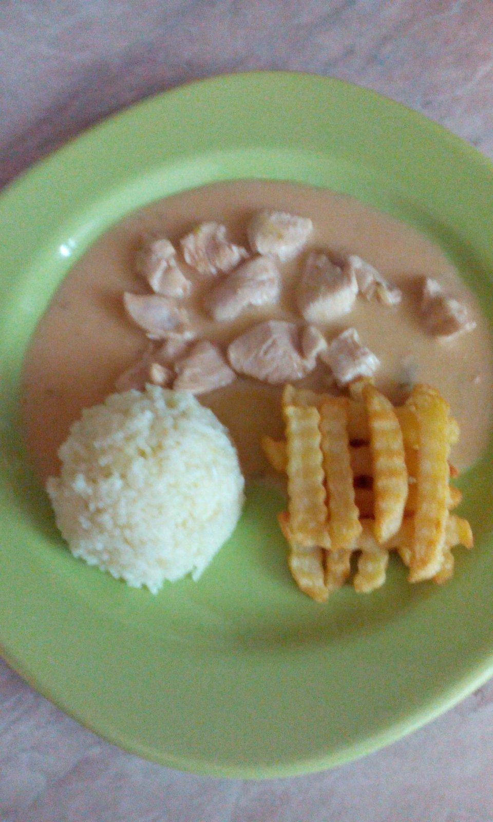 kuracie prsia, mala som z 1 1/2 kuraťa, 1 cibuľa - dnes som na ňu v tej rýchlosti zabudla, 1/2 pohára ster. uhoriek, 3 PL horčice, 1-2 PL kečupu, mlieko podľa potreby cca 3-4dl (môžebyť aj smotana, ja už som nemala), 1 PL hl. múky, soľ, ml. korenie, olej, príloha - cestoviny