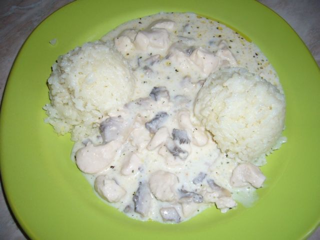 Umyté maso nakrájame na rezance, pridáme nakrájané šampiňóny, soľ, mleté čier. korenie a vegetu ( podľa chuti ). Zmes premiešame a dáme smažiť na malé množstvo rozohriateho oleja. Podlejeme asi 100ml vody a dusíme do makka. Keď je maso makké, pridáme roztlačený cesnak, a bazalku ( podľa chuti ). Zmes zahustíme smotanou s hladkou múkou. Podávame s cestovinou alebo ryžou. Dobrú chuť.