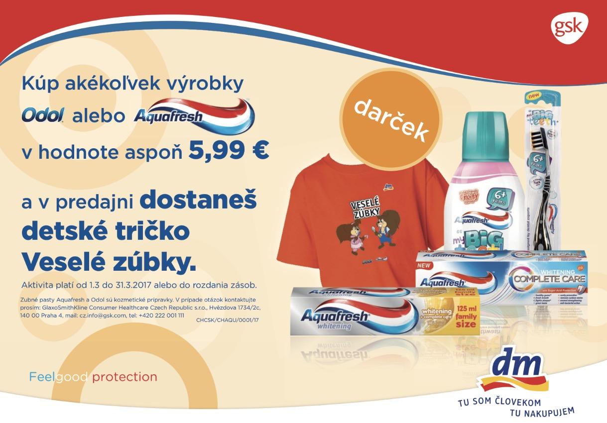 Maminky ak nakúpite v dm akékoľvek výrobky značky Odol alebo Aquafresh v minimálnej hodnote 5,99 € dostanete k nákupu tričko !!! Detské veľkosti na 4,6 a 8 rokov 😉