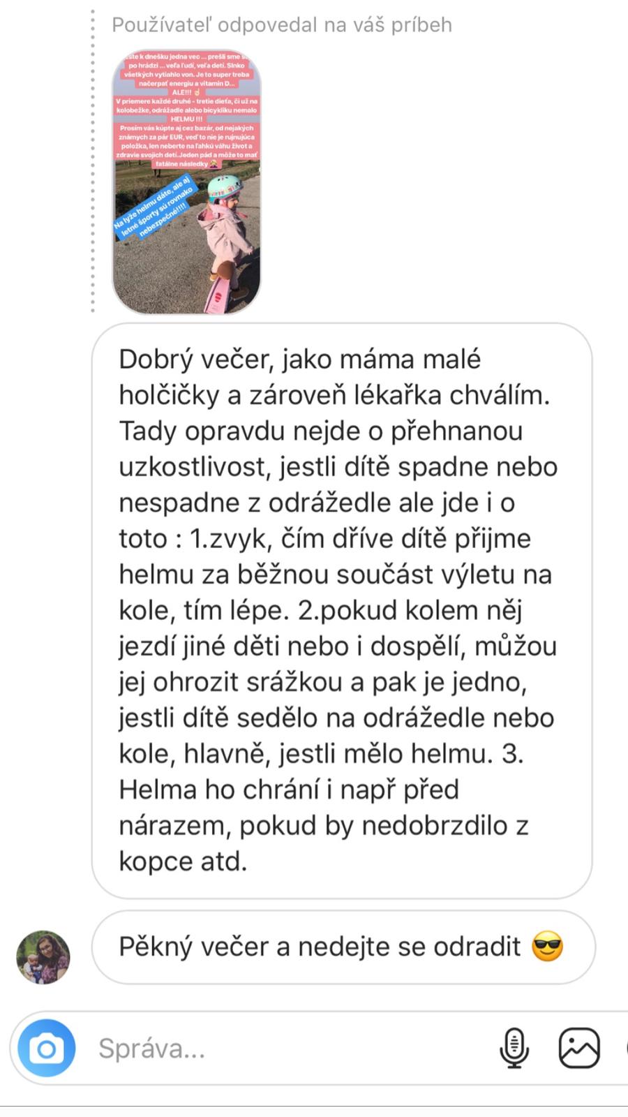 Na Instagrame som spomenula môj postreh z nedeľnej vychádzky, že v priemere každé druhé-tretie dieťa na kolobežke, odrážadle alebo bicykli nemalo prilbu. Nasledovala lavína reakcií a správ. Nedá sa zverejňovať všetko, ale zopár Vám ich pridávam aj sem.