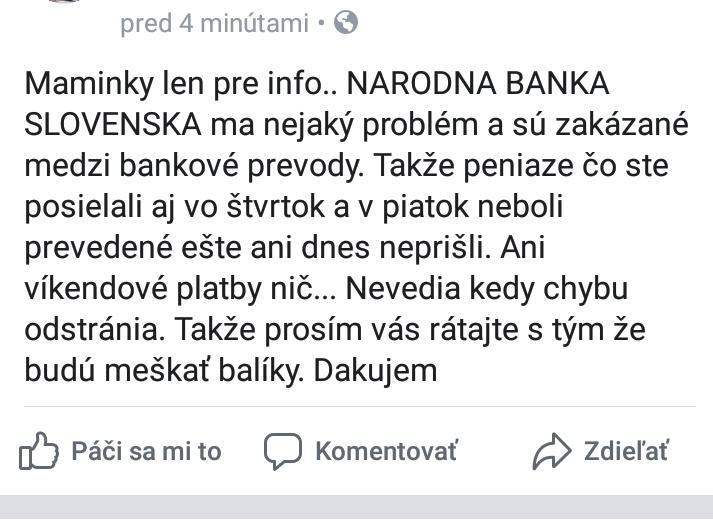 @misuliacik81 Veď práve aj ja som pozerala a nič som nenašla. Osobne si myslím že keď má NBS takýto probkém, mali by aspoň nejaké info hodiť do pléna + každá banka by mala v takom prípade vyhodiť pri vstupe na stránku nejaké upozornenie že haló čosi nefunguje .... Ľuďom neprichádzajú platby a tu na MK (jasne, jasne MK vie všetko) len tak mimochodom čo sa nedozviem . Och