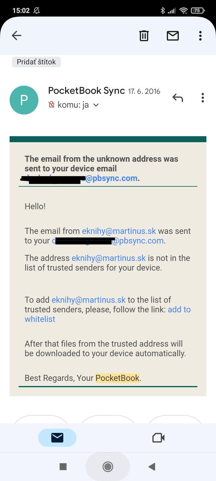 Pri zakladaní pocketbook účtu s tou koncovkou si musela zadať aj svoju klasicku adresu. Na ňu ti príde vždy adresa z ktorej prvýkrát budeš chcieť niečo do čítačky poslat. Treba v Tom maily kliknúť na link nech pridá tu adresu na zoznam povolených adries. Potom už ti z tej adresy všetko automaticky príde.