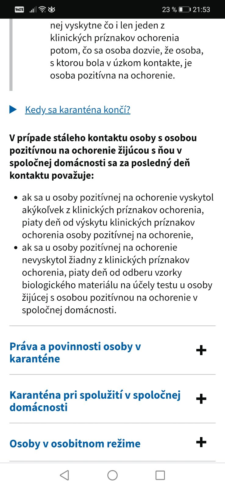 @ajuska111 my sme to mali tak isto. Potvrdila to aj pani z RUVZ. Keď nemá žiadne príznaky, tak platí druhý bod. Piaty deň od odberu sa považuje za posledný deň kontaktu. Napr. odber v sobotu je deň nula. Štvrtok je piaty deň a od piatku + 14 dní. A príznaky sa môžu objaviť aj neskôr. A keby muž išiel na pcr test, a vyšiel pozitívny tak by sa mu rátalo14 dní od toho odberu.