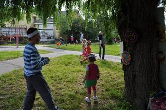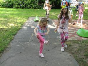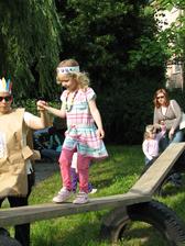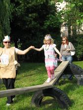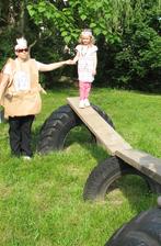 Rovnováha Dosky medzi stromami a dieťa prechádza s pomocou, či bez a snaží sa zapamätať obrázky visiace na špagátiku.