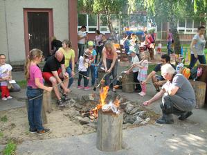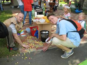 Dokrmovanie Vo vedre s vodou je malá číra nádoba a do nej deti hádzu z výšky malé kamienky – potrava pre ryby.