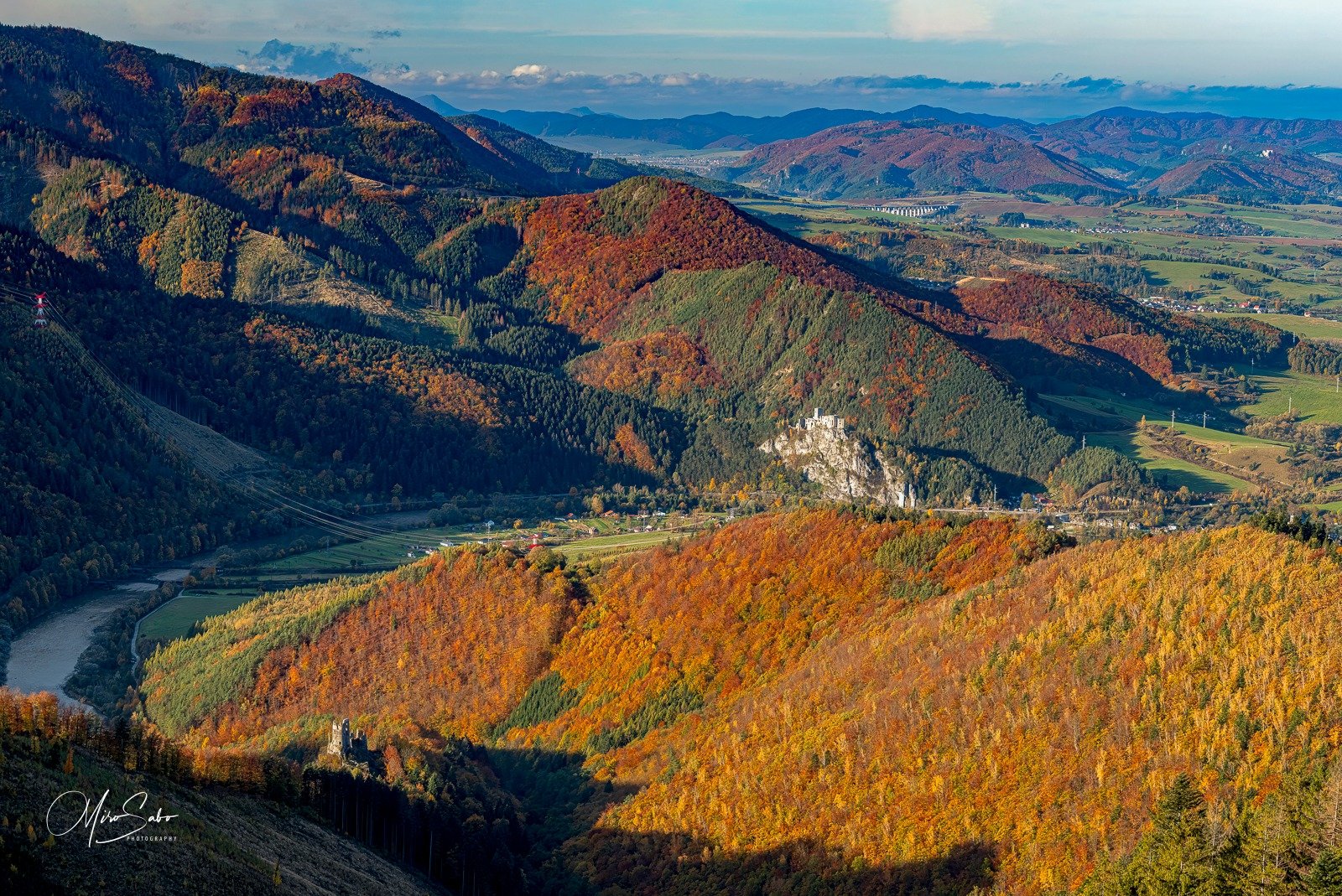 Slovensko, tri hrady na fotke - Starhrad, hrad Strečno a vpravo hore Lietavský hrad