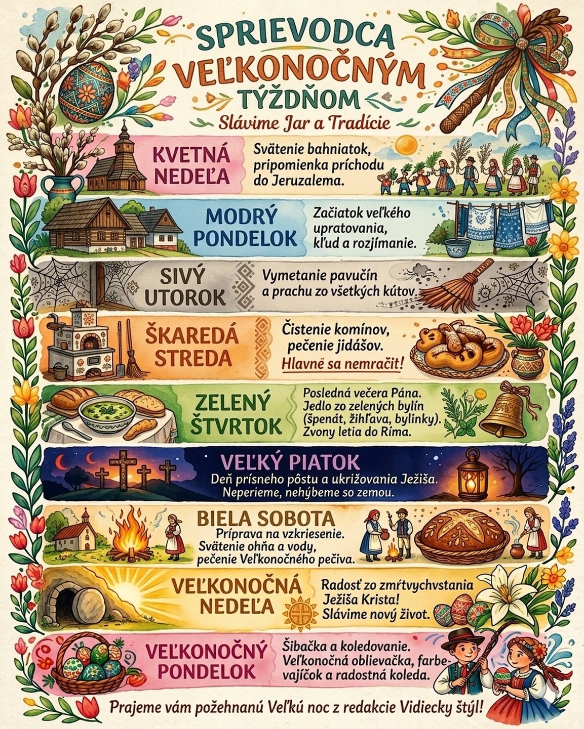 Veľký piatok Veľkonočný týždeň pokračuje Veľkým piatkom – dňom spomienky na utrpenie, ukrižovanie a smrť Ježiša Krista. V rímskokatolíckych chrámoch sa na Veľký piatok neslúži svätá omša, oltáre sú bez chrámového rúcha. Evanjelici považujú tento deň za najvýznamnejší sviatok, pretože Syn Boží dokončil dielo vykúpenia sveta. Veľký piatok je zároveň časom prísneho pôstu, rozjímania, modlitieb, pašií a očistných obradov. Podľa ľudových tradícií sa tento deň zakazovalo hýbať zemou, pretože sa verilo, že ešte spí – táto obyčaj má korene v starých kultoch uctievania zeme. Ľudia verili, že zem je zjari ťarchavá – mnohí sa jej klaňali a bozkávali ju s nádejou, že sila zeme prejde takýmto dotykom i do človeka. Mnohé ženy dodnes na Veľký piatok stierajú z jarných lúk rosu. Na Veľký piatok sa vzťahuje aj prísny zákaz pitia alkoholu. Gazda, ktorý by to porušil, by bol údajne v lete stále smädný a hrozilo by mu, že ho uštipne had.