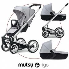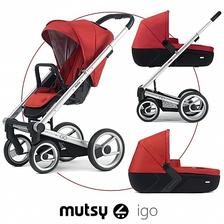 Mutsy IGO Standard AIR) je mimoriadne elegantný a komfortný kočík vhodný od šiestich mesiacov dieťaťa až do troch rokov. Prevedenie Standard má koženú, teleskopicky nastaviteľnú rukoväť, vďaka ktorej je výškovo nastaviteľná aj pre vyššie osoby. Ľahká hliníková konštrukcia je striebornej farby. Predné 22,5 cm kolesá sú otočné o 360° s aretačnou poistkou a ešte väčšie 29 cm zadné kolesá sa dajú ľahko zabrzdiť bezpečnostnou brzdou. Kolesá je možné rýchlo a jednoducho odpojiť kvôli kompaktnejšiemu uloženiu. Mutsy IGO Black má všetky kolesá bezúdržbové (penové a pogumované) a je vhodnejší do mesta. Mutsy IGO Standard AIR má predné kolesá bezúdržbové a zadné kolesá nafukovacie gumové a preto je vhodný aj do horšieho terénu. Konštrukcia sa ľahko a jednoducho skladá na plocho. Konštrukciu je možné zložiť aj s pripnutou športovou sedačkou. Sedačka kočíka je bezpečná, pohodlná a priestranná. Je ľahko vyberateľná a možno ju upevniť v smere jazdy a aj proti smeru jazdy, tak aby dieťa mohlo mať výhľad na dospelého alebo okolie. Opierka chrbta a opierka nôh sú polohovateľné do viacerých polôh pre sediace aj ležiace dieťa. Strieška sedačky je sklápateľná so slnečnou clonou a s prekrytým okienkom. Bezpečnosť dieťaťa v kočíku zabezpečujú aj päťbodové nastaviteľné pásy s ramennými vložkami a odnímateľné madlo pred dieťaťom potiahnuté ekokožou. Kočík má priestranný a spevnený odkladací košík. Pre dieťa počas prvých mesiacov je systém vybavený veľmi ľahkou vaničkou LITE s vetracím okienkom a integrovanou sieťkou proti hmyzu, ktorú je možné na konštrukciu bezpečne a jednoducho pripojiť. Vlastné nožičky ju pri postavení na zem chránia pred zašpinením. Strieška vaničky je polohovateľná a jej súčasťou je aj rúčka na prenášanie. K vaničke je aj vrchný zateplený kryt. Na konštrukciu kočíka je možné bezpečne pripnúť aj autosedačku Maxi-Cosi CabrioFix,
