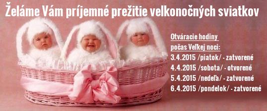 Otváracie hodiny počas Veľkej noci3.4.2015 (piatok) - zatvorené4.4.2015 (sobota) - otvorené od 9:00-17:005.4.2015 (nedeľa) - zatvorené6.4.2015 (pondelok) - zatvorené