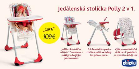 - vhodná pre deti od 5 mesiacov až do 3 rokov - Polly je skutočná, maximálne pohodlná a bezpečná jedálenské stolička, ideálna na obdobie prechodu z dojčenia - v ďalšej fáze života dieťaťa je možné pultík zo stoličky odňať a stoličku Polly tak zasunúť k ľubovolnému stolu - bezpečnosť zvyšujú aj 5-bodové bezpečnostné pásy a pevný adaptér proti skĺznutiu zo stoličky - jemné, pohodlné a dvojité polstrovanie - nastaviteľná opierka chrbta do 3 pozícií - sedátko je nastaviteľné v 7 výškových polohách - nastaviteľná opierka nôh - odnímateľný pultík s držiakom na hrnček - rozmery (D x Š x V): 82 x 63.5 x 104 cm